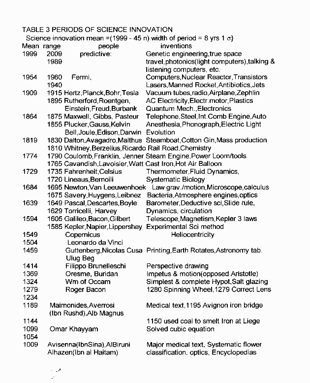 In the pattern of human activity there is observed a 45 year cycle of innovation, of creativity and the types of change that happen. There is a period of about 20 years where there is science innovation, but while there are numerous "firsts" in science the humanities are "conservative" and do not change. There is a transition of about 2 to 4 years and then the humanities have numerous experiments and changes, but science becomes stagnant and does not innovate. This cycle can be represented by the central date of the science innovation period being at (1999 - 45 n) where n is any integer, and presumably predictively even 0 or negative numbers that will project into the future. The humanities innovation centroid dates are represented by (1977 - 45m) where m also is an integer, presumably including 0 or negative numbers. EQUATIONS Science Innovation Mean date = (1999 - 45 n) ± 8 year variance of 1 s (± 10 yrs 90% probability) Humanities central date = (1977 - 45 m) ± 8 year span of 1 s (± 10 yrs 90% probability) (The time span is such that 67% of all events fall ± 8 yrs from mean, 97.5% of the events are ± 16 yrs, and approximately 90% ± 10 years) There is a major war associated with each science period. Associated with the humanities periods are minor or "brush fire" wars. The major wars are roughly 50-100 times more violent than the minor wars. These run like a ticking clock back for more than 120 cycles. While I discovered this independently, I have found in the literature an analysis by the late Professor Raymond H. Wheeler, of the University of Kansas, from 1950 going back to 600 BC. and later an extended analysis by Edward R. Dewey going back even farther for 116 cycles which reported a 22.2 year period -later refined by Dewey to 21.98 years, He modifies the amplitudes of the main cycle with sub cycles of 142 and a less important 57 year cycle. It is the war cycle which is synchronous with this 45 year pattern which allows us to trace the cycle so far back in time. While the innovations are often poorly recorded, the battles and major wars are relatively well recorded. I reserve the right to maintain the 45 year period I discovered rather than accept the 22 years cycle of Dewey, since with so many cycles the 22.5 year half period versus 22.0 (21.98) would cause a phase shift after 975 years such that the centroid dates would be totally out of phase. They are not, and 45.0 fits better than any other number.