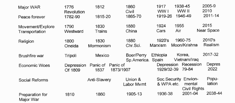 Every time has a feeling, a mentality, a zeitgeist, an attitude, an aura, which goes with that period. There is a progression of these climates, of these attitudes which follow one another in the 45 year cycle. Frequently there is no clear line of demarcation between one attitude and another, it is not necessarily clear where one stops and the other starts. This pattern is presented below for several cycles in the United-States.