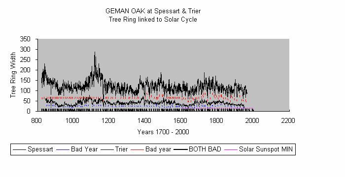 Below is a list of recent el Nino and la Nina events, as recorded present to about 1800, and reconstructed from German Forest data Oak Trees from Spessart and Treir deduced from tree rings with unusually small or unusually large rings adn only where BOTH agreed, i.e. to eliminate local weather conditions. These also agree with the pattern from Chile Trees, from Java and From Bristlecone pines. of California/ Nevada.