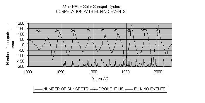EL NINO A Correlation Between Sun Spot Cycles and El Niño Dr. James H. L. Lawler 1997 There is a correlation between Solar Sun spot cycles and El Niño events. Every year following a minimum number of solar sun spots is an el niño year. The el niño events also happen at other times in between these 11 year cycles, but every solar minimum is associated with an el niño event. Since the el niño event happens on the average about every 6 years the sun spots predict about half of them. There is a long record of accurate solar sun spot observations starting about 1600. These number of sun spots fluctuate from a quiet time with very few, 10 or even less, visible sun spots to major activity, up to about 200 sun spots visible on any given day. These follow roughly an 11 year cycle with peaks every 10.57 years on the average, but with as much as 1.5 years variance observed in the cycle length. The cycles alternate with leading North and South magnetic poles. Every other cycle has leading NORTH magnetic poles, and the alternate cycle has leading SOUTH magnetic poles, thus the real full cycle is 21 years, not 10.57. Dr Hale noticed this and he plotted every other cycle "upside down" to graphically represent this "Hale" 21 year pattern. In addition to the Hale cycle, there is a longer range 110 year pulse of activity, the magnitude of the peaks grows from about 11 cycle maximums to a maximal activity of about 200 sun spots visible on any given day, with peaks centered on roughly 1785, 1860 and 1960 and then activity declines with peak activity reaching only perhaps 100 sunspots ca 1690, 1810, 1910, and projected to 2020 with a decline from the recent peak activity of 1989-1991 at about 210 sunspots. The peak activity of circa 2001 should be ca 160-180, and by 2010-11 down to 140-150 with the peak ca 2021-2022 down again to about 110-120 sun spots. 1996/7 is a Solar minimum. From 1600 until about 1700 the sun was going through an unusual period of minimal activity, the "Maunder minimum", where the climate of Europe became unusually cold. For example ice froze on the canals of Holland for the first time in recorded history. There also was another minimum circa 1200-1300 that is not well recorded. In Europe we have no solar records at all, but Chinese records do partially record this solar minimum. The results were catastrophic world wide. In Peru the Wari culture had such a long drought that the population of the capital city declined form about 50,000 to about 25,000. They literally starved to death. The Mesa Verde Indians in Colorado, now USA, abandoned their entire main cultural site and moved to where they could find enough water. In Europe the cold forced a major change in customs. First the Kings and Queens and then the "Lords and Ladies" moved into smaller, private, warmer bedrooms, instead of living in open, drafty, and poorly heated "Great Halls" of the Castles as was the custom prior to 1200. Since 1700 the sun spot activity has peaked regularly every 11 years, (10.57 actual mean period) with minimum activity below 20 sun spots, even below 10 sun spots visible on any given day for typically over 100 days in a row. There have been three super cycles of about 110 years observed. The trees leave a record of bad growth years in their rings. This unusually small tree growth pattern has been observed in Germany in the Spesart and Trier forests back to 820 AD, and in the USA in 20 different zones back to before 1800 AD, and in Indonesia back to 1500 AD. They all coincide exactly. Looking at tree ring data we can project these solar cycles backwards with some confidence to about 820 AD adding 6 more super cycles and over a hundred 10.57 year cycles. As mentioned before these solar cycles alternate. The spots come in pairs with leading north magnetic poles one cycle and then next cycle leading south magnetic poles in the next cycle; so in order to accommodate and represent this Professor Hale alternated every other cycle above the axis below the axis. This "Hale" presentation follows a 21 year period rather closely. The extreme el niño events follow the hale cycle even closer than the 11 year cycle, and 1976, 1954, 1933, 1912, 1892. and 1866 all were extreme el niño cases with severe droughts world wide. If we add 1997 that will complete the predictive nature of the observation and tend to confirm the hypothesis. El niño events, unfortunately, are not all that well recorded. While I was in Peru in 1996 I went to the national library for two days and made a brief search of the records. Prior to 1890 only very scattered records in personal diaries telling of unusual weather conditions exist. There are no formal records at all. From the other records I was able to add 1878, 1866, 1857, 1842/3, and 1832 events. This needs to be researched better, since I had limited time and could not do as thorough a job as is really needed. But knowing when to look, some of the years el niño is expected, should aid in the research. What happens, and WHY? The sun spots appear to be associated with more energy reaching earth, and solar minima are associated with less heat, or global cooling. The oceans are vast reservoirs of heat for earth and by Le Chatelier's principle will try to react so as to minimize any change in solar heating. Thus the oceans and weather react to release heat from the oceans to the continental masses at minima. In this time Peru receives both more heat and more water. But if Peru gets more water, some other area must get less... in fact most will get less since there is less total energy to produce water vapor. Thus el niño is associated with drought in most places. Australia, areas of Indonesia, the US high planes and the Russian/ Asian steppes all suffer. The monsoons also fail in India. The el niño brings added water from the ocean, to costal Peru and moderation (warming of the coldest months, cooling of the warmer months) of the pacific Peruvian costal climate, but also dumps water 