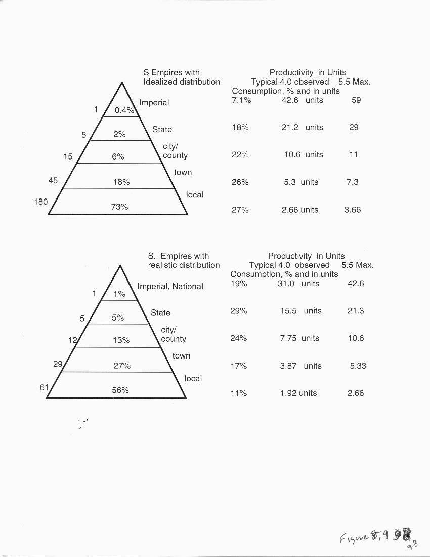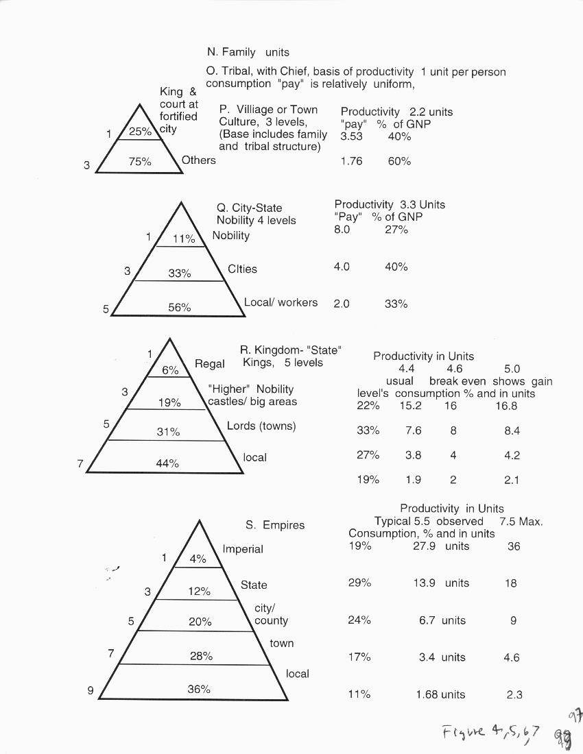 The upper stages live in "regal" luxury, and the wealth that they consume is such that the total left for the peasantry actually may fall in most cases. If the productivity increases enough, then at a "break even" of 4.6 they are equally well off, and at 5.0 they have a minor increase in standard of living over the prior stage. This is shown in figure 5 which shows a comparison of the three pyramids for stage P (Town, Mayor) , stage Q (city state) and stage R (Kingdom). Level Base 1,2 3 4 5 Population P 3 1 Distribution 75% 25% By level Q 5 3 1 56% 33% 8% R 7 5 3 1 44% 31% 19% 6% Distri- P 60% 40% bution Q 34% 40% 26% total value R 19% 26% 33% 2.6%