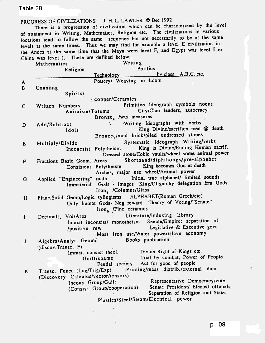 SUMMARY OF PROGRESSIONS Putting most of the progressions together, and comparing them to a specific sequence of the most advanced civilizations at the time, these progressions can be combined with the 700-1400 year cycle as shown in Table 26. Taking the time scale off the axis, this then gives a progression of conditions which are typically present at the same time. This is shown in Table 27, and 28. This pair of tables is meant to provide a new abstraction separated from the 700 year cycle. The letters A, B, C, D, etc. now represent stages of civilization. They do correspond to the specific 700 year cycle they came from, but other cultures do not follow the same time scale, but do follow the sequence. For example the Inca (Inka) of Peru were in stage mixed C, D, B at 1500 AD when the Spanish who arrived in their territory were in Stage J. The Inca had fine ceramics (C and higher, because they had them one thousand years prior make that D -B), and dressed stone (B), without arches (not yet F), but lacked writing (B or at least pre or near C because of string memory knots), and pre B in King rejecting human sacrifice. The Maya were writing glyphs D, and still doing human sacrifice (pre B thus D), etc. so matching the sequence, but at a different time. Thus the letters give a good index of cultural development independent of time scale. Thus the cultures can be classified by comparison of several progressions, to obtain a "status"
