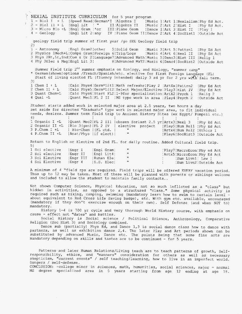 There has been proposed a Nexial FOUNDATION ION for instructional / teaching purposes. (interestingly enough this name was also agreed as to name and purpose by the Colorado Nexial Institute - we both arrived at a similar concept and purpose, and in part a means of getting to that purpose !) This foundation would teach young students Nexial concepts and provide an unparalleled education. . The Foundation in this version lacks funding to construct and operate a campus. The Campus would take gifted children (and ONLY gifted children) at roughly age 12 to 13 -but mental age 16 , i.e. by the conventional IQ standards, those of IQ 135 and up, and in 5 years of schooling graduate young men and women with the equivalent of depth of roughly 5 college Bachelor's degrees, and one specialist Master's degree. The classes will be of normal University quality, and aim at elimination of useless repetition for these students. Also the summer "Vacation" has been eliminated. There is more loss (forgetting) in the summer than is reasonable, and this in intended to give a uniform learning all year around with 4 eleven week terms, and 4 two week breaks that are usually scheduled field trips and or activities to broaden the student's experience. This is envisioned as a boarding school situation, with the parents and or siblings being particularly invited to share the 4 two week break excursions. The Language requirements are typical Nexial departure from "normal". The entering student will elect a major foreign language to attain fluency. (If the student is already bi or poly lingual they will be given full credit for that, and they will elect another different language for study, but may elect either / any of the primary languages for additional study, particularly in Literature of that language (or languages). The goal is that every graduate will be at minimal fluently bilingual, and have a working knowledge of a third language. The student will receive an intensive 2 years education in ten elected language, and in the third year will be immersed in the language 24 hours a day, using it for almost all activities. They will speak it at school home , and if they do not ask for "por favor las papas fritas" they will not get the fried potatoes. The vacation times in 3rd and 4th year where practical will be to that nation to get first hand accent from the native speakers. IN the 4th adn 5th year they will also be required (assuming they were not already at least trilingual at this point) to study a third language to a working level, (but not full fluency). All of the classes are aimed at this higher level of attainment, and the "grades" are NOT the main emphasis, but obtaining working knowledge IS the emphasis. Also the tree of knowledge will be "pruned" to remove useless exercises that have no use in later life. Example derivations in math will be discarded except for a few that offer mental exercise or to give a required depth of understanding as to restrictions or assumptions which will only be "tolerated". If it has no further use, it will be discarded. This is a liberal education with a vengeance, reaching for the limit of mankind's understanding in virtually all areas. It does require re-thinking of what is useful, but also demands exploration in depth that usually is not available except to specialists. They will be generalists with a breadth that is unthinkable in today's world.