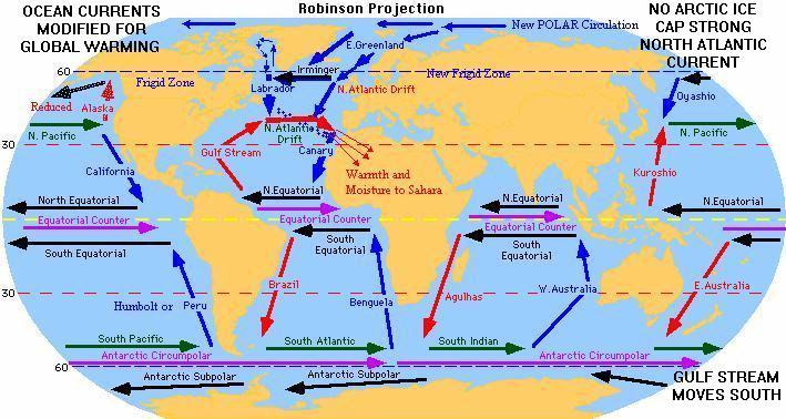 With melted ice cap there IS a strong Arctic current that in turn forces Gulf Stream south to Africa - delivering rain to the Sahara, while in N America the stronger North Pacific (Japaneese) current keeps heat from the Alaska current and not going to Canada, but to the California current, causing warmth there, but a frigid zone in Canada, a totally different weather pattern.