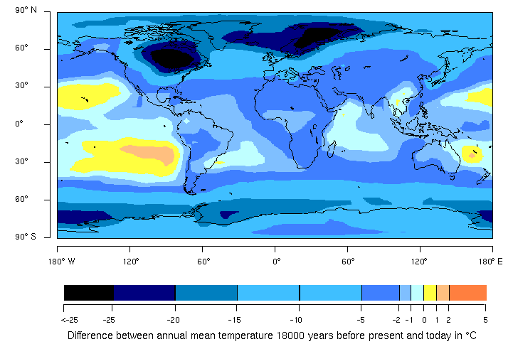 Change in Temp from ice age (18,000 BP) shown and today, Note while N hemisphere was MUCH colder then, the S. Pacific Ocean was actually warmer.